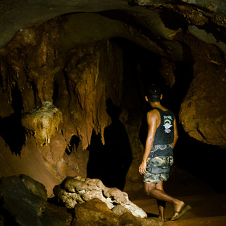 ทางเข้าถ้ำที่เหมือนหลุดไปอีกโลก: จุดหมายหลักของเราคือ "ถ้ำผีหัวโต" ครับ ตอนเราพายเรือลอดเข้าปากถ้ำขนาดใหญ่ ความรู้สึกมันเหมือนเรากำลังเดินทางย้อนเวลาเลย ข้างในถ้ำโถงกว้างและเย็นสบาย มีหินงอกหินย้อยที่สวยงามตามธรรมชาติ